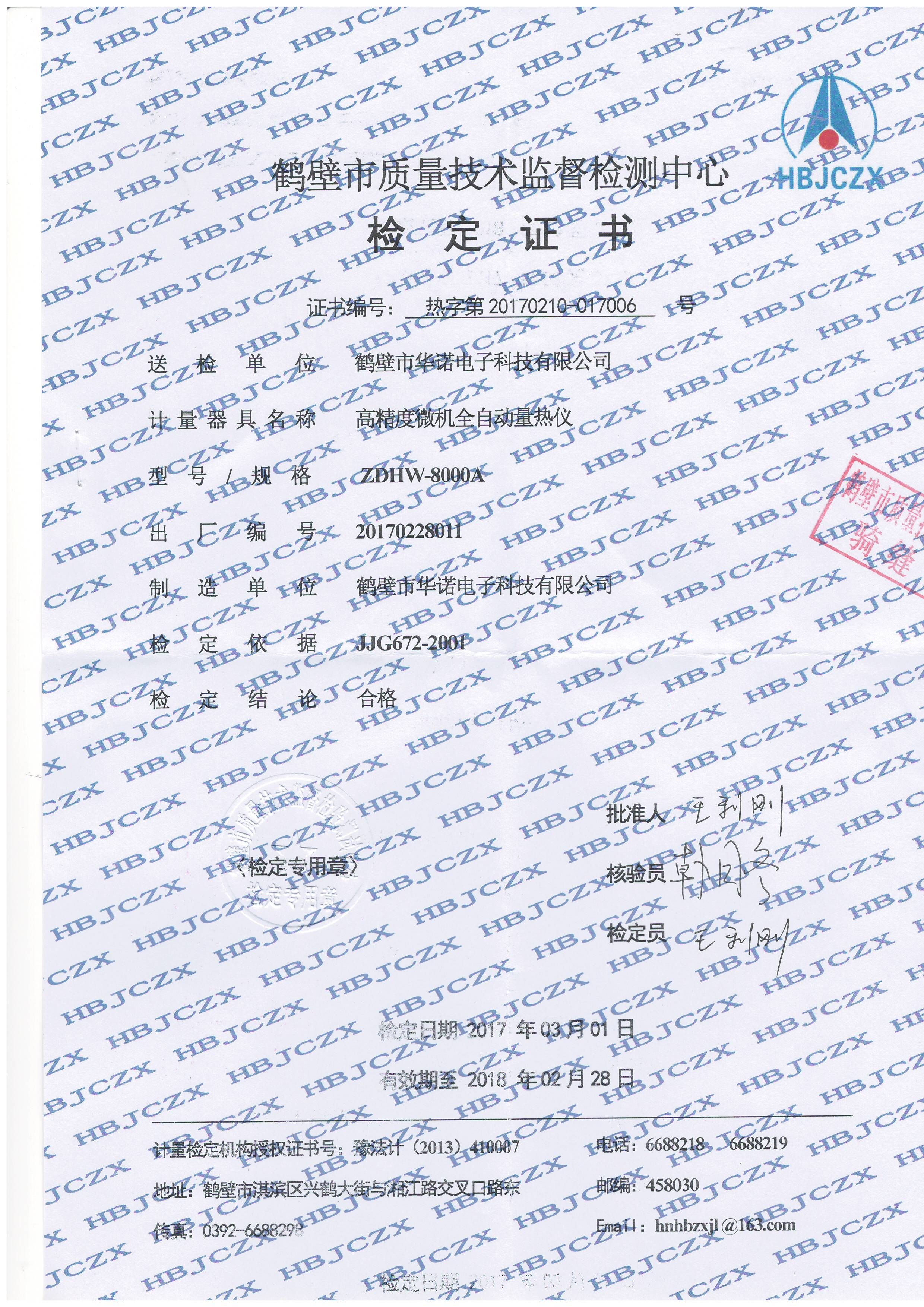 鶴壁市華諾電子科技有限公司是一家專業(yè)研制、生產(chǎn)煤質(zhì)采制樣分析儀器儀表的高新技術(shù)企業(yè)。在社會經(jīng)濟高度發(fā)達的今天,我公司長期堅持“質(zhì)量產(chǎn)生效益,質(zhì)量贏得市場”的理念矢志不移。如今公司在質(zhì)量管理方面已經(jīng)形成了一套完整的體系,上周經(jīng)過公司相關(guān)部門討論,領(lǐng)導(dǎo)決定為出廠的每臺量熱儀辦理“身份證”,即生產(chǎn)的任何型號的量熱儀都要通過鶴壁市質(zhì)量技術(shù)檢測中心檢定并且合格才能出廠運送給客戶使用,鶴壁市質(zhì)量技術(shù)檢測中心會為接受檢定的量熱儀出具檢定證書,上面會詳細的標(biāo)出量熱儀的型號、出廠編號、檢定結(jié)果等。鶴壁市華諾電子科技有限公司要讓每一位客戶買的放心、用的舒心。
